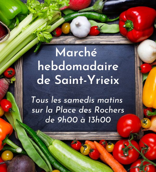 Retrouvez les commerçants du marché hebdomadaire de Saint-Yrieix tous les samedis de 9h à 13h sur la place des Rochers. Retrouvez ici toutes les informations sur les marchés.