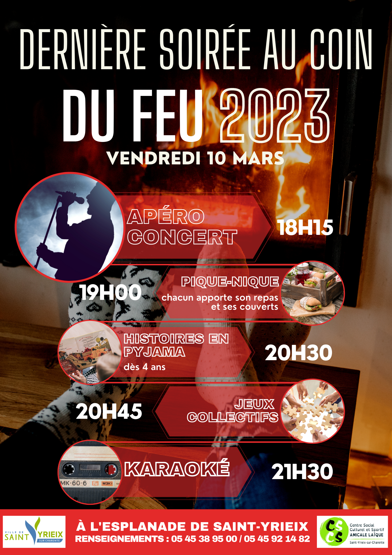 Elle est de retour la "Dernière soirée au coin du feu". Comme toujours la convivialité sera le seul mot d'ordre. Au programme : concert, jeux collectifs, repas tiré du panier (chacun apporte son repas, ses assiettes et couverts), histoires en pyjamas, karaoké...